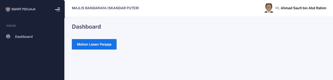 Pendaftaran yang berjaya akan dibawa ke dashboard pengguna. Klik 'Mohon Lesen Penjaja' untuk permohonan baru.