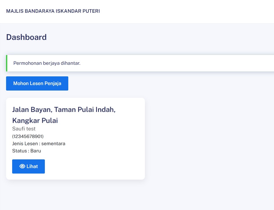 Sekiranya permohonan berjaya dihantar, paparan di bawah boleh dilihat di dashboard anda.
